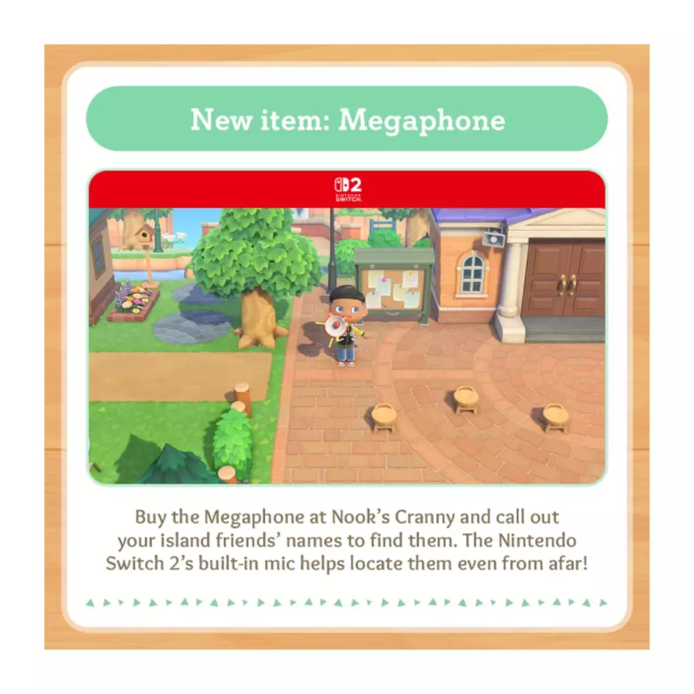 Never struggle to find your friends again. The new Megaphone, available from Nook’s Cranny, lets you call out their names, and the built-in microphone of the Nintendo Switch 2 helps locate them, even if they’re far away.