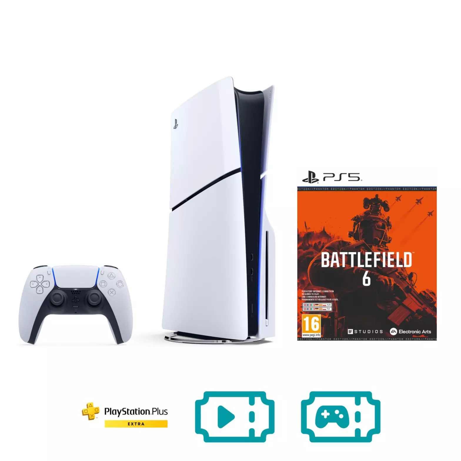 Unlock an incredible gaming experience and get a massive £125 EE GameCard when you purchase this gaming bundle. This all-in-one package includes a sleek PS5® Slim Disc Console, 24 months of PlayStation Plus Extra and exclusive EE Data Passes to keep you connected wherever you play. For the battlefield strategist, you can use the EE GameCard (worth £125) to redeem Battlefield™ 6 Phantom Edition. See more details below.