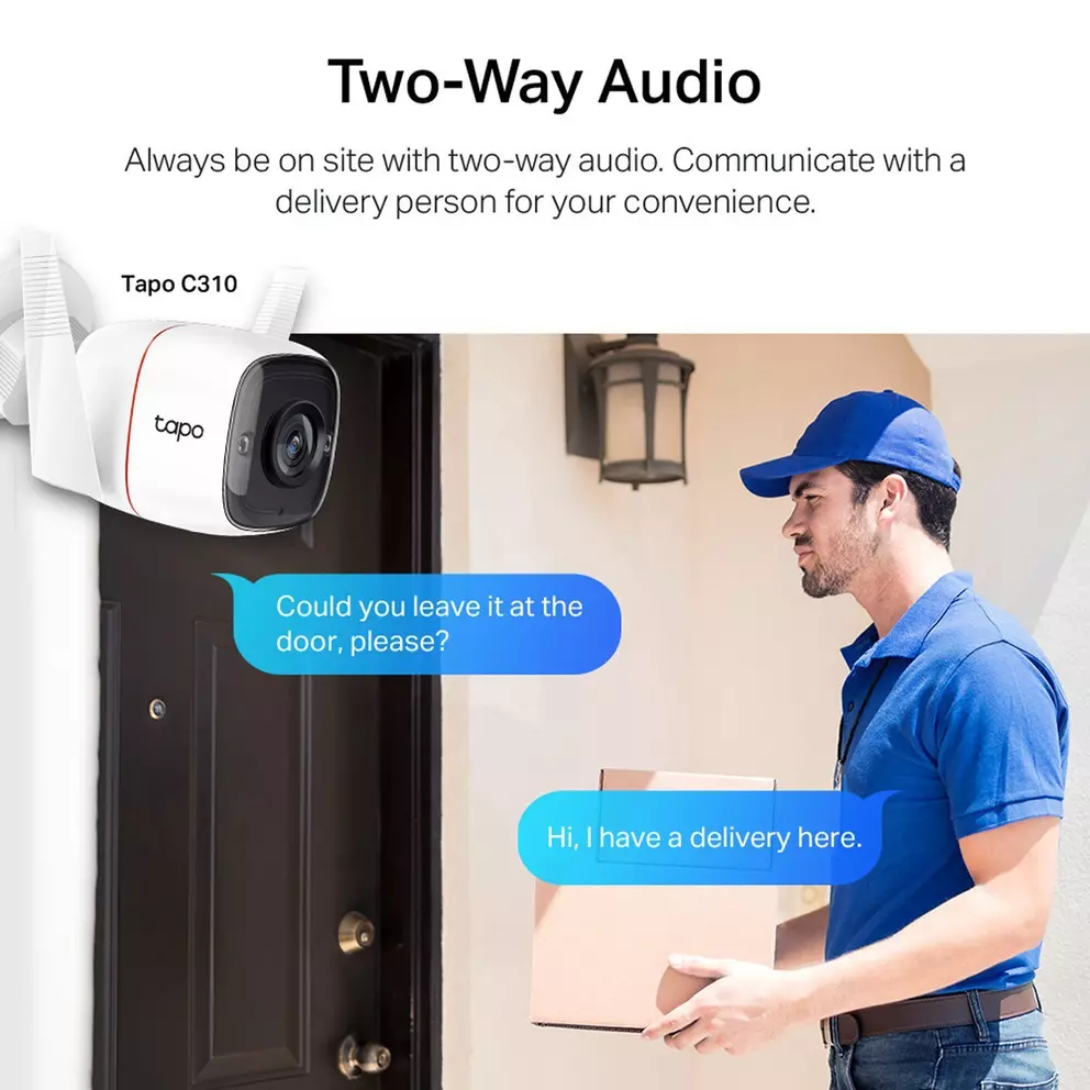 Chat with anyone near your camera using the Tapo C310’s 2-way audio feature. This allows you to communicate clearly and directly, whether you’re checking in on a visitor or instructing someone to leave your property.