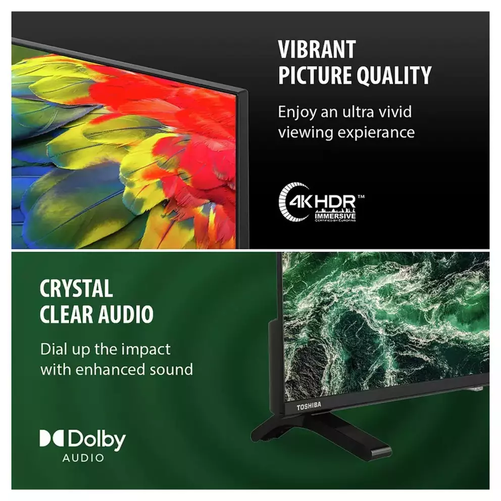 Bring every scene to life on the large 4K Ultra HD display. Powered by Toshiba TRU Picture technologies, this UV1563DB Smart TV delivers sharp detail, smooth motion and lifelike clarity. With Dolby Vision and HDR10 support, each scene is optimised individually, revealing incredible detail in both bright highlights and deep shadows for a truly cinematic viewing experience.