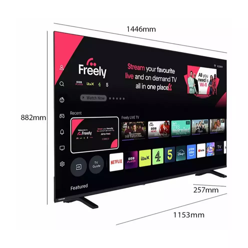 Relax and enjoy a smarter, more immersive home entertainment system with the Toshiba UV1563DB 4K Ultra HD Smart TV with Freely. Ideal for upgrading older or smaller TVs, it combines brilliant 4K picture quality, cinematic HDR and easy access to live and on-demand TV through an intuitive Smart TV platform.